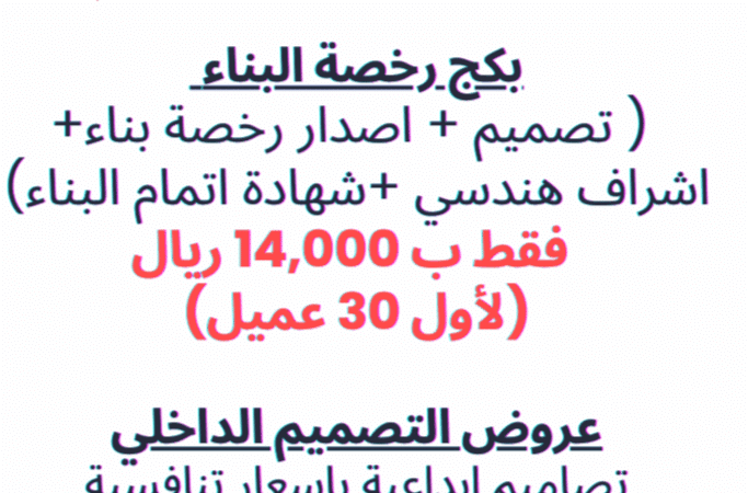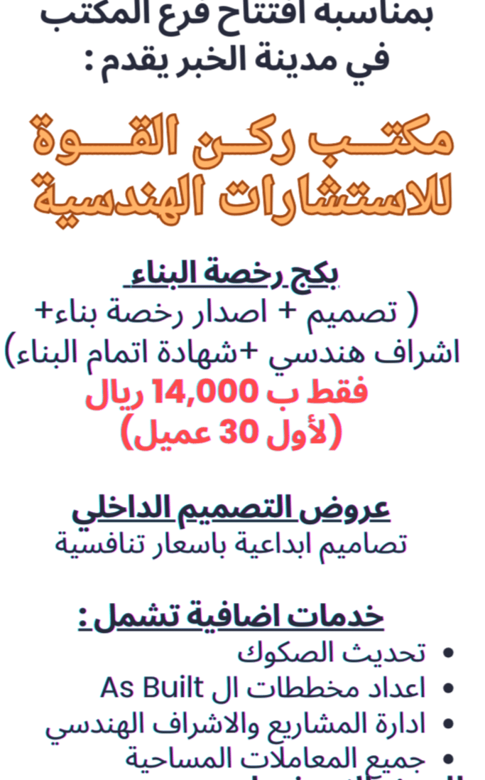 يعلن مكتب ركن القوة للاستشارات الهندسية فرع الخبر عن تقديم عروض مخفضة ومميزة بجودة عالية لفترة محدودة، لدينا مهندسون ذوو خبرات في مختلف التصاميم ثنائية وثلاثية الابعاد، استخراج رخص البناء والاوراق الرسمية من مختلف الجهات ذات الاختصاص، اشراف على التنفيذ