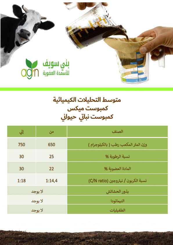 كمبوست نباتي حيواني ناتج من كمر المخلفات النباتية والحيواينة لمدة ثلاثة أشهر , لذلك يعمل على تحسين بناء الأراضى الرملية وتخصبها وتحسين صفات الأرض الطبيعية ويؤدى إلى زيادة الإحتفاظ بالماء و ترشيد إستخدام الاسمدة الكيماوية لما يحتوية من العناصر الكبري المغذية ( النيتروجين , الفسفور , البوتاسيوم ) و العناصر الصغري المغذية , كمبوست ميكس خالي من النيماتودا و بذور الحشائش و فطريات أعفان الجذور و دلائل البكتريا الممرضة .